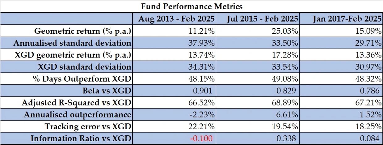 Alpha is the level of outperformance of the portfolio against the XGD, expressed in annualised terms.